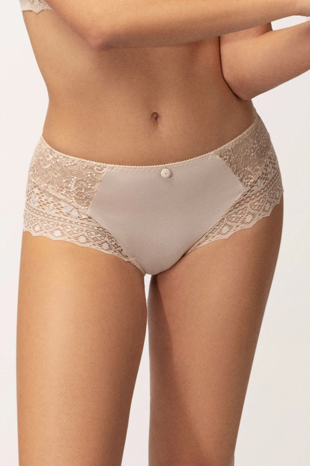 So komfortabel wie reizvoll präsentiert sich dieses Höschen, das allerlei Passen gekonnt miteinander verbindet. Besonders interessant sind natürlich jene mit mehr oder weniger Transparenz, die abwechslungsreiche Muster auf die Haut zeichnen. Opak ist der vordere Einsatz, der dem silbrigen Anhänger eine perfekte Unterlage bietet. Ein schmaler dehnbarer Bund mit kessen Mäusezähnchen rundet das Dessous ab.