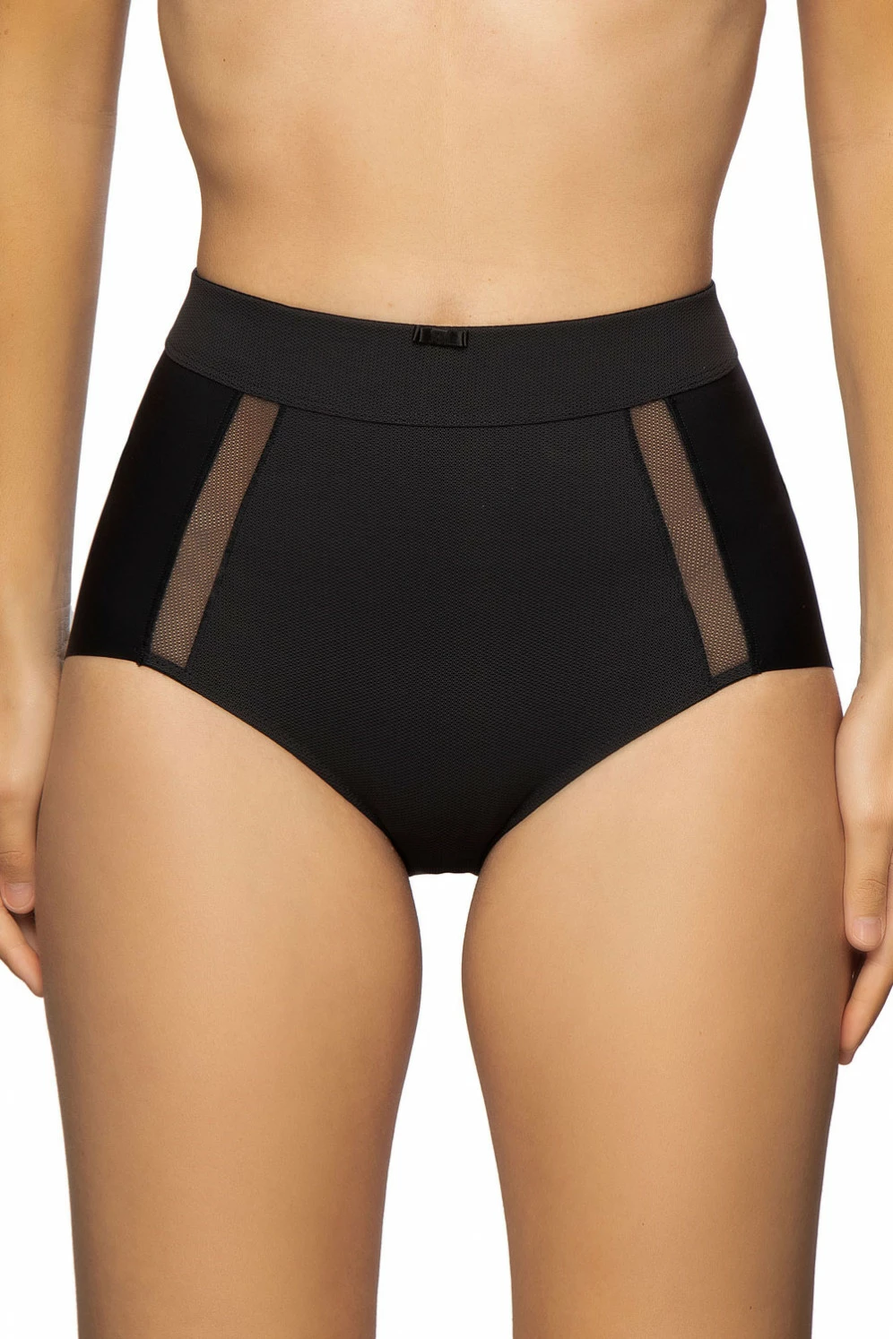 Die Taillenpanty vereint zwei wunderbare moderne Materialqualitäten. Die weite vordere Passe besteht aus unterlegtem weichem Mesh und wird flankiert von Streifen einlagigen Tülls. Daran grenzt bereits die nahtfreie Rückenpartie aus softer Mikrofaser mit Cleancutrand. Der Bund ist angesetzt, vorn etwas verbreitert und mit einem süßen Schleifchen geschmückt. Dank des enorm hohen Elasthananteils sitzt das Höschen einwandfrei – wie eine zweite Haut.
