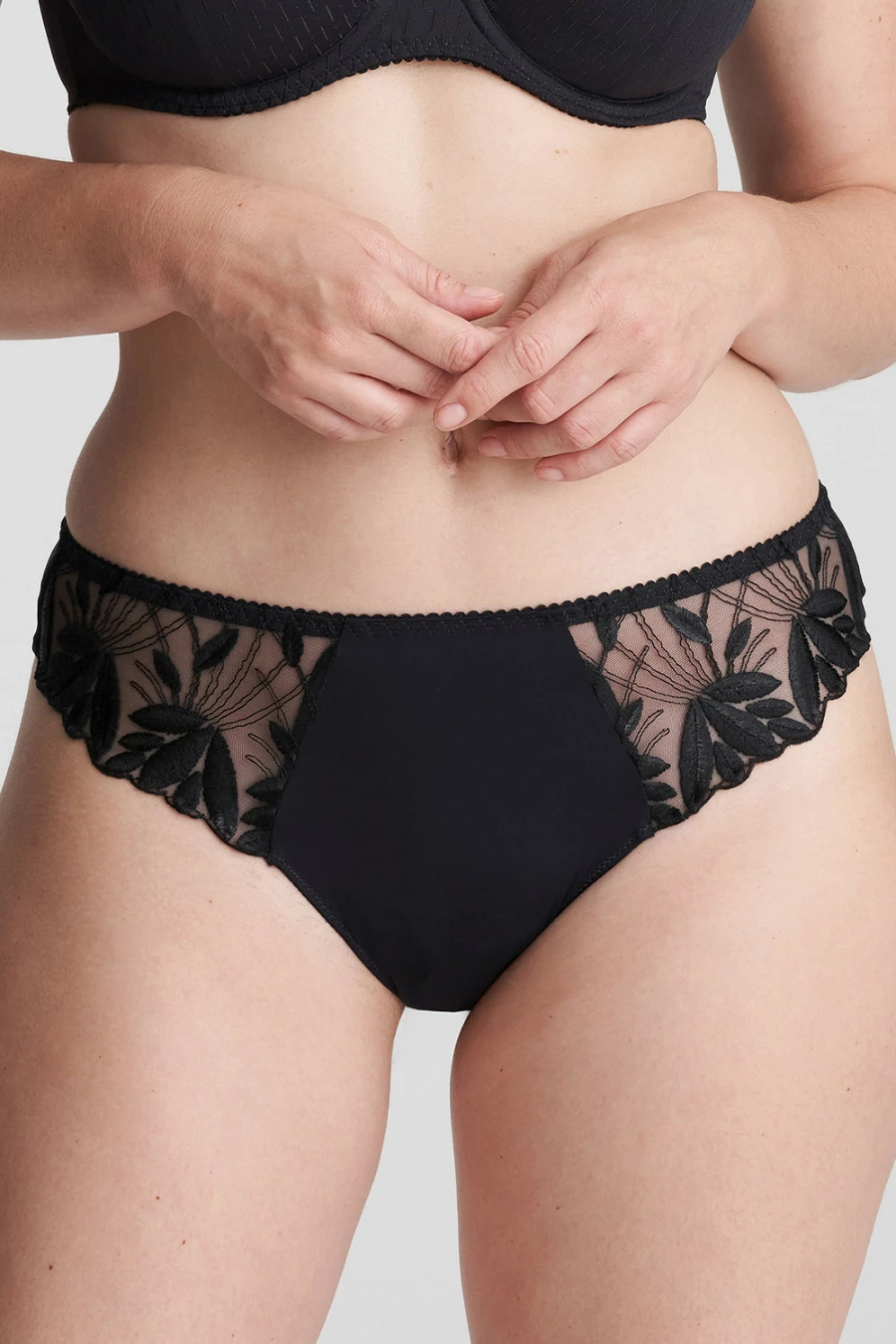 Sich soft anschmiegender String aus leichten Dessousmaterialien. Die vorn seitlich dezent eingearbeiteten bestickten Tüllpassen begeistern mit ihrem Blattmuster sowie dem Glanz, der von den verwendeten Garnen ausgeht. Die Beinränder weisen ganz schmale Ziernähte auf, entlang des Bundes ist das Höschen mit weicher Bogenpaspel elastisch versteppt. Dank seiner Seitenhöhe von etwa 5 Zentimetern fällt die Bedeckung moderat aus, was vielen Frauen gefallen dürfte.