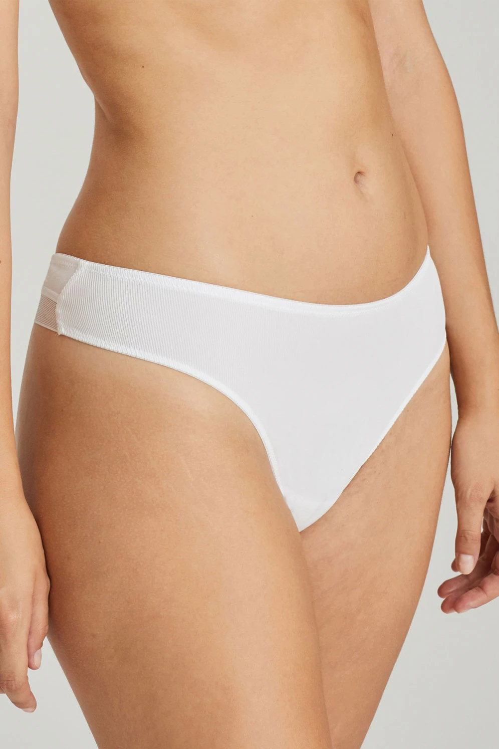Ein aus feinem Rippstoff gefertigter, schlichter String der Marke PrimaDonna twist. Hoch ausgeschnittene Beinabschlüsse mit feinen Bändern aus Strukturtüll betonen den Po und schenken eine sexy Optik.